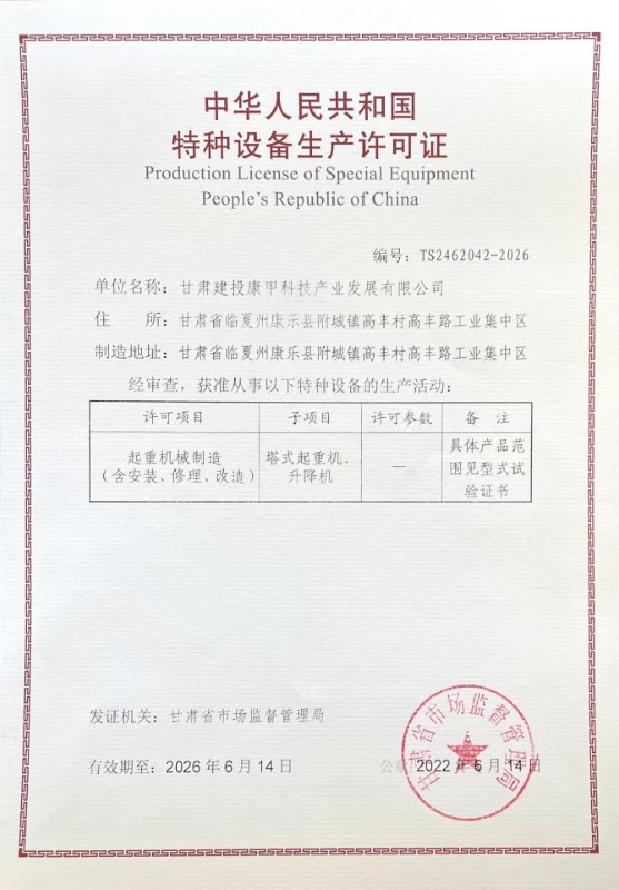 此次取证工作自2022年3月底开始至今,装备公司在人员、技术、设备、原材料等方面为康甲公司提供了全面支持,为取得特种设备生产许可奠定了基础。康甲公司各部门通力协作,完成质量保证体系建设,并严格按照质量保证体系要求完成塔式起重机和施工升降机的试生产,专家组从资源条件、体系运行、试生产等三个方面进行了评审,经甘肃省市场监督管理局复核相关资料,按照相关法律法规决定授予康甲公司特种设备生产许可证。