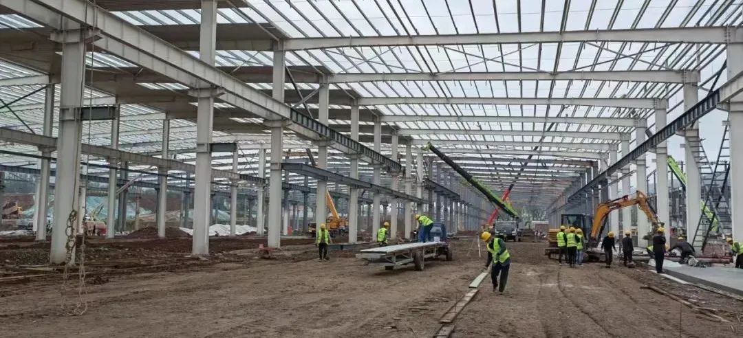 截止目前,1号研发中心门窗已安装完成,正在进行内、外墙抹灰及保温板安装;玻璃厂钢柱、钢梁安装全部完成、屋面檩条完成40%,防火涂料施工、彩钢板安装、外墙砌筑、压顶梁混泥土浇筑、排水管沟、房心土回填、地面硬化等其他各道工序正在有序展开;食堂及会议室主体施工完毕,屋面炉渣保护层浇筑完成,准备进行防水处理,正在进行地沟开挖浇筑,三层模板拆除;2号公寓正在进行三号厂房钢柱、钢梁安装全部完成,正在进行楼承板安装、防火涂料施工、屋面Z型钢安装,外墙砌筑;2、3号门房短柱浇筑、地梁钢筋绑扎正在施工。6、8号厂房、玻璃厂材料库井桩成孔、混凝土浇筑;7号厂房钢柱、钢梁安装全部完成,正在安装楼承板、楼梯。