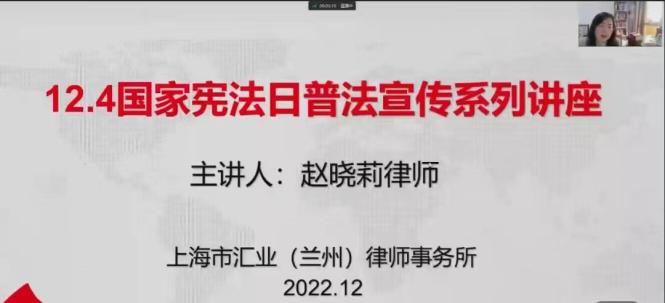 本次讲座以线上形式进行,以“学习宣传贯彻党的二十大精神,推动全面贯彻实施宪法”为主题,邀请了上海市汇业(兰州)律师事务所赵晓莉律师围绕宪法解读,宪法的地位、宪法的发展历史、我国宪法的架构及具体内容;民法典之合同热点解读,主要就民法典中涉及的电子合同、预约合同、情势变更制度等热点问题进行解读;公司行业性质,就民法典关于审理建设工程施工合同纠纷案件适用法律问题的解释等方面的内容进行了专题讲解。