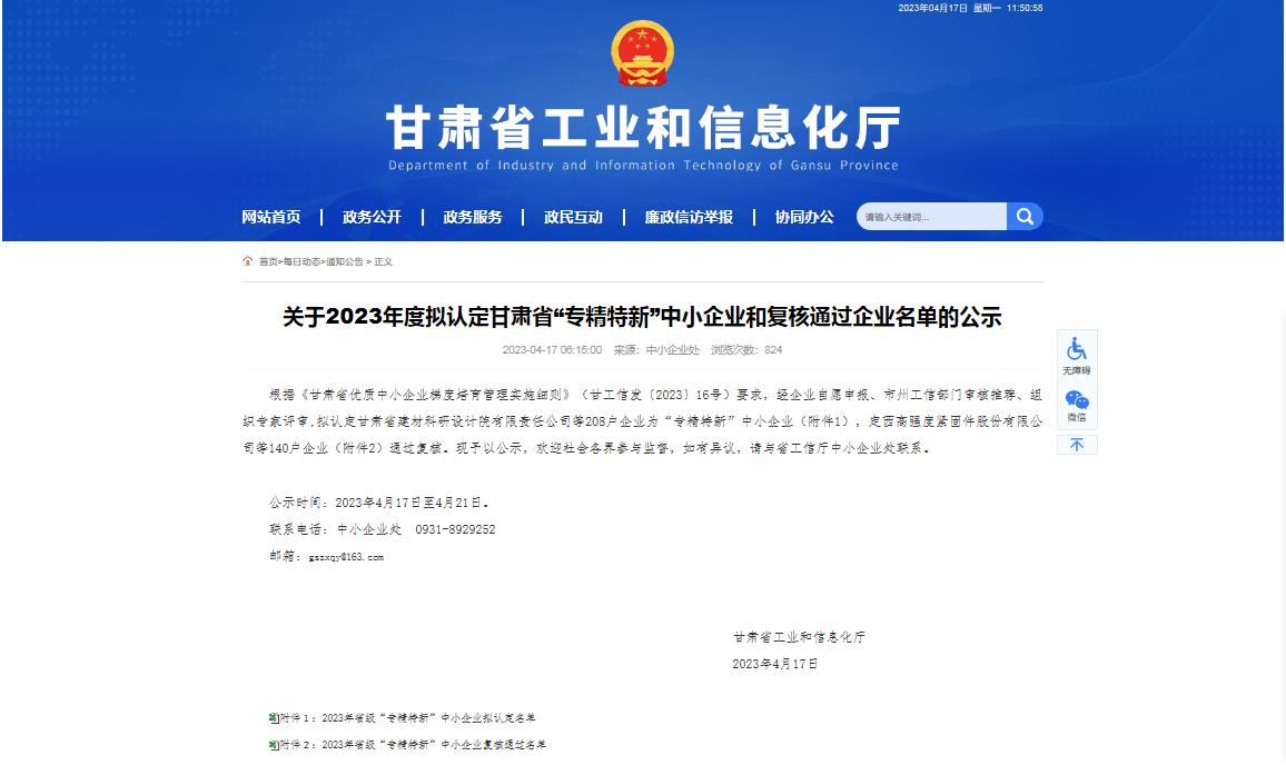 甘肃省工信厅近日发布《关于2023年度拟认定甘肃省“专精特新”中小企业和复核通过企业名名单的公示》,爱游戏体育(中国)官方网站-AYX SPORTS 装备公司凭借优秀的技术研发实力和自主创新能力,通过了2023年甘肃省“专精特新”中小企业认证。